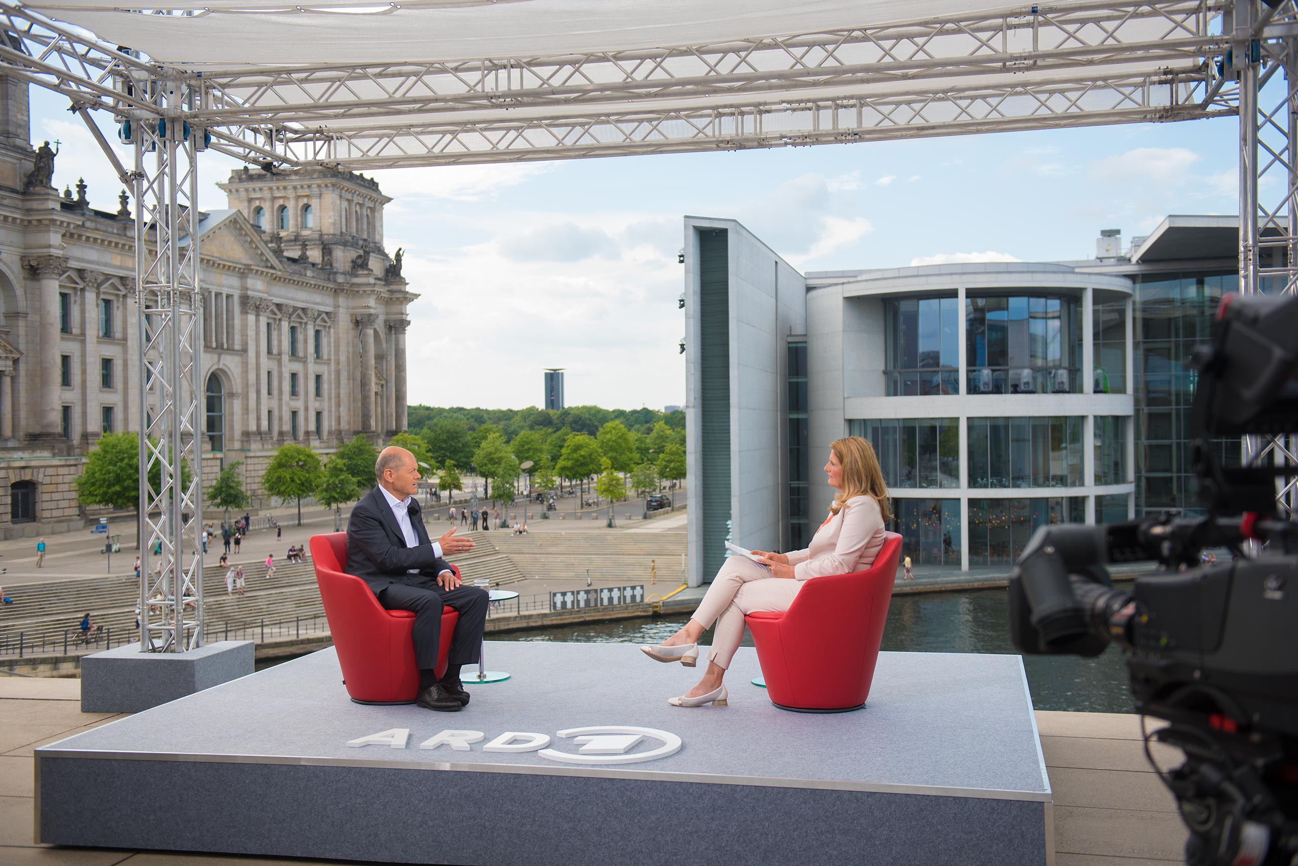 Als Fotograf für die ARD am Set des Sommerinterviews ("Bericht aus Berlin", "Frag selbst"). Heute war SPD-Kanzlerkandidat Olaf Scholz an der Reihe und das Interview führte Tina Hassel, Leiterin des ARD-Hauptstadtstudios.